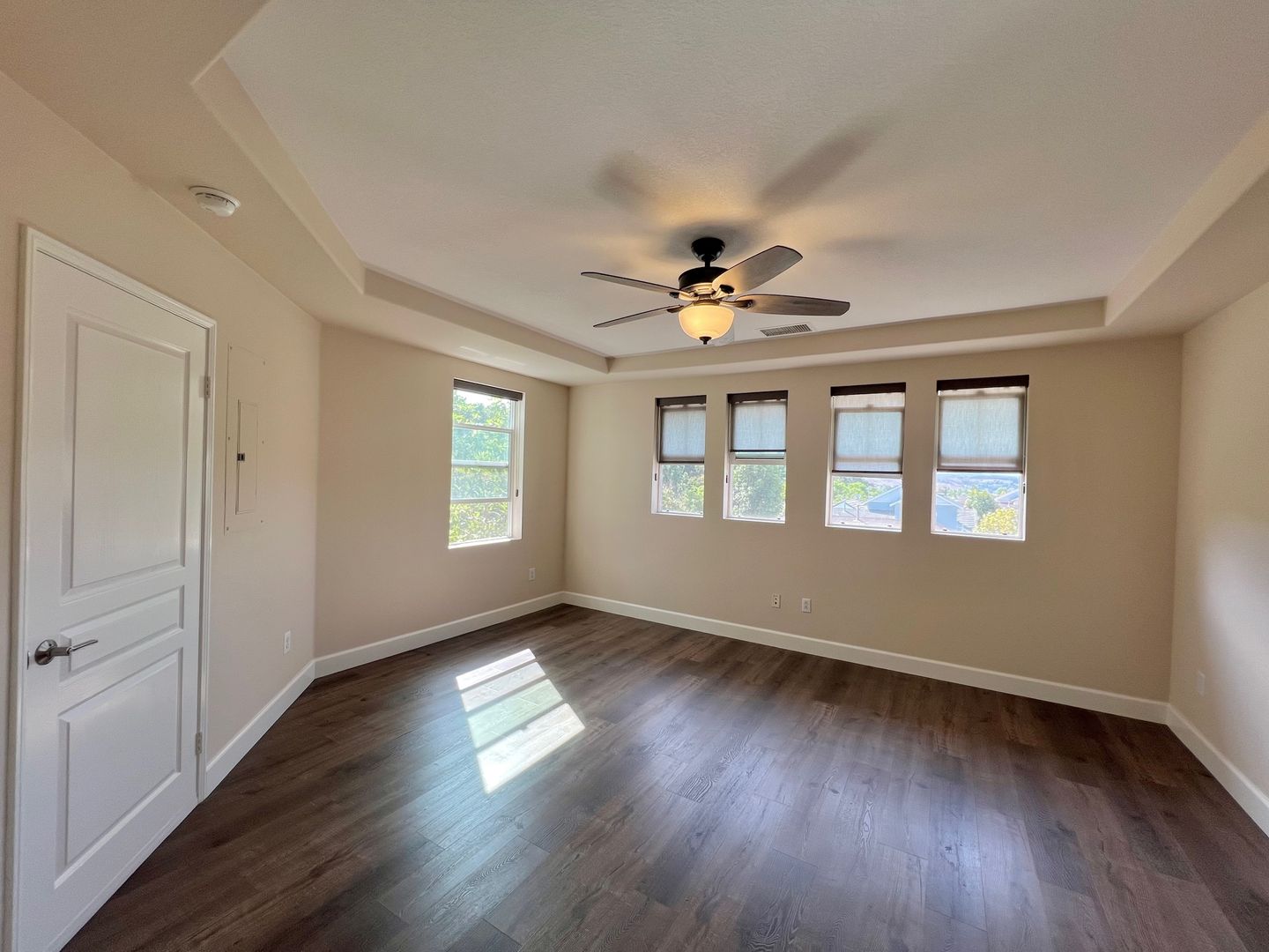 Spacious 1 Bedroom 1 1/2 Bathroom Townhome with many upgrades. The home features high ceilings, LVP flooring, recessed lighting, upgraded kitchen with stone countertops, includes stainless steel appliances, stackable washer/dryer included, living room with access to the balcony, spacious bedroom suite with en-suite bathroom and walk in closet, central ac & heating, 1-car attached garage with direct access. Located in a well-maintained community with access to pools, parks, and trails.