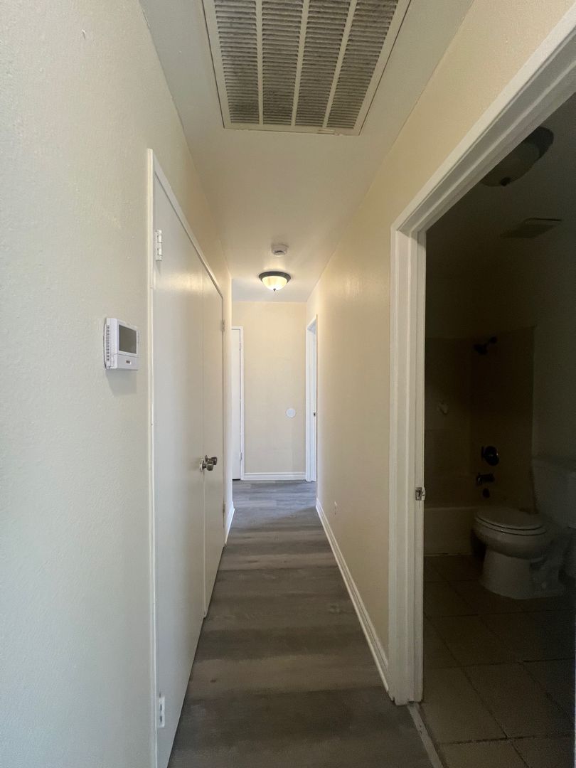 Spacious 3-bedroom 2 bath Duplex, 2 Car garage, new paint, new laminate wood floors, tile floors, stove, new exhaust fan, vaulted ceiling, lots of storage and closet space, w/d hook ups in the hallway, Master bedroom with walk in closet and bathroom, and front yard.