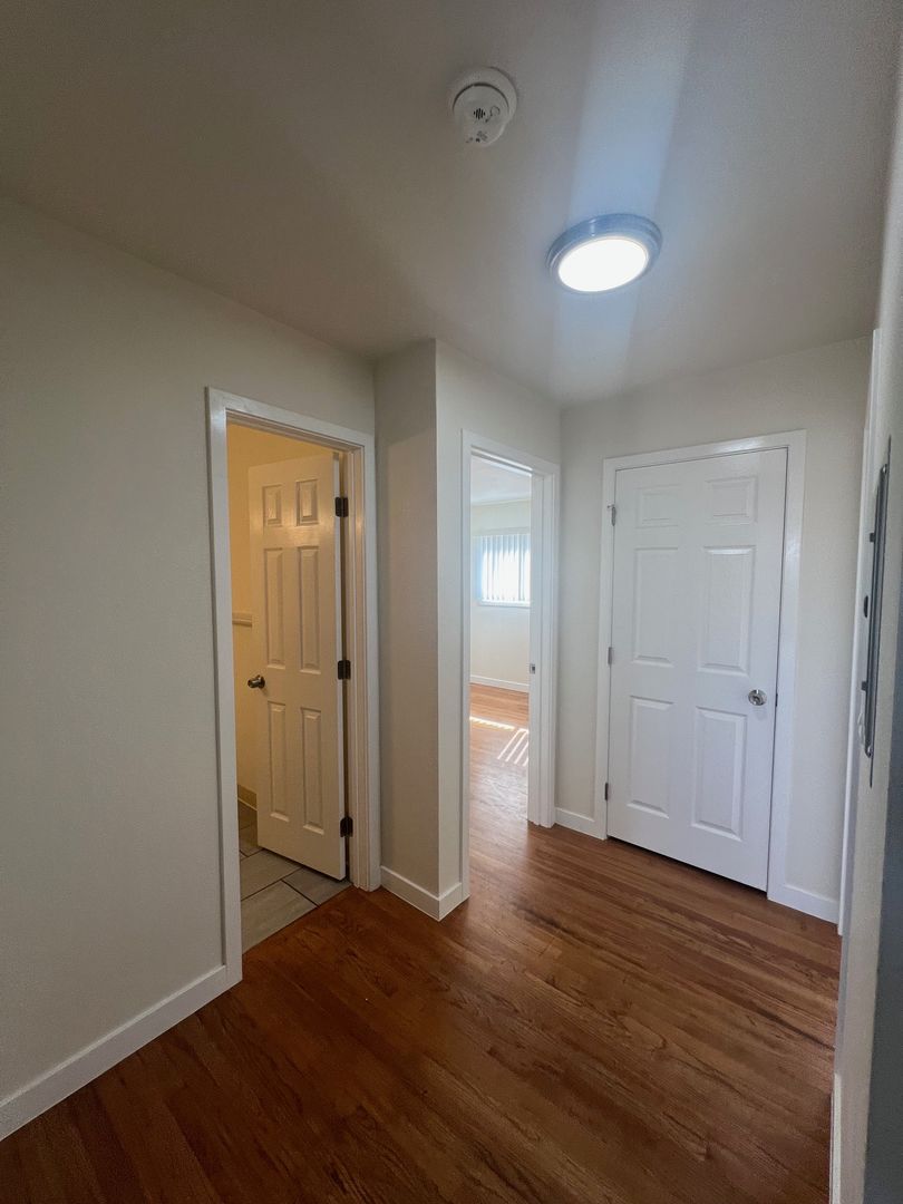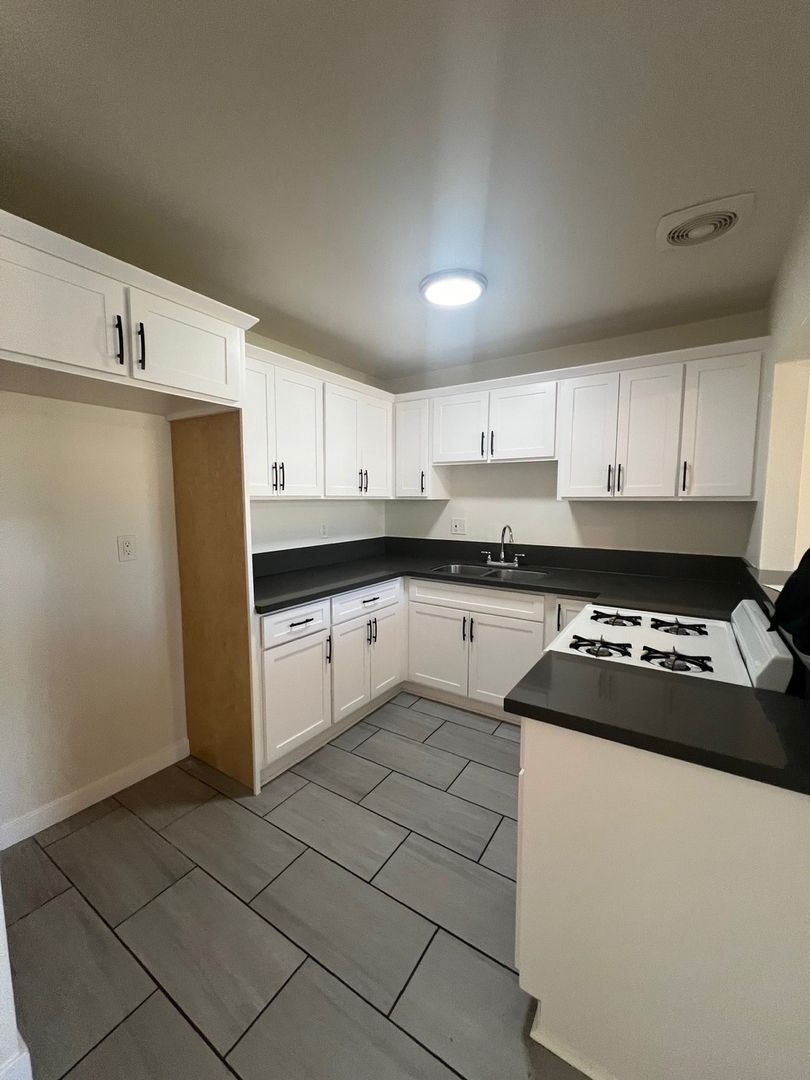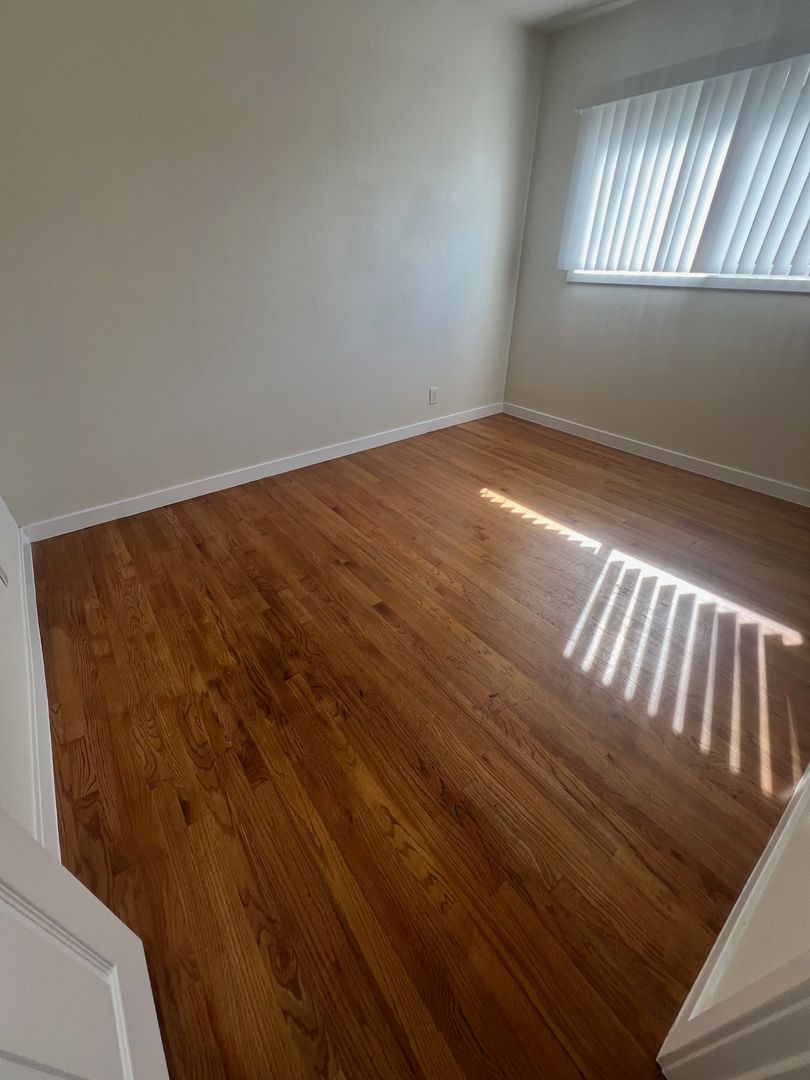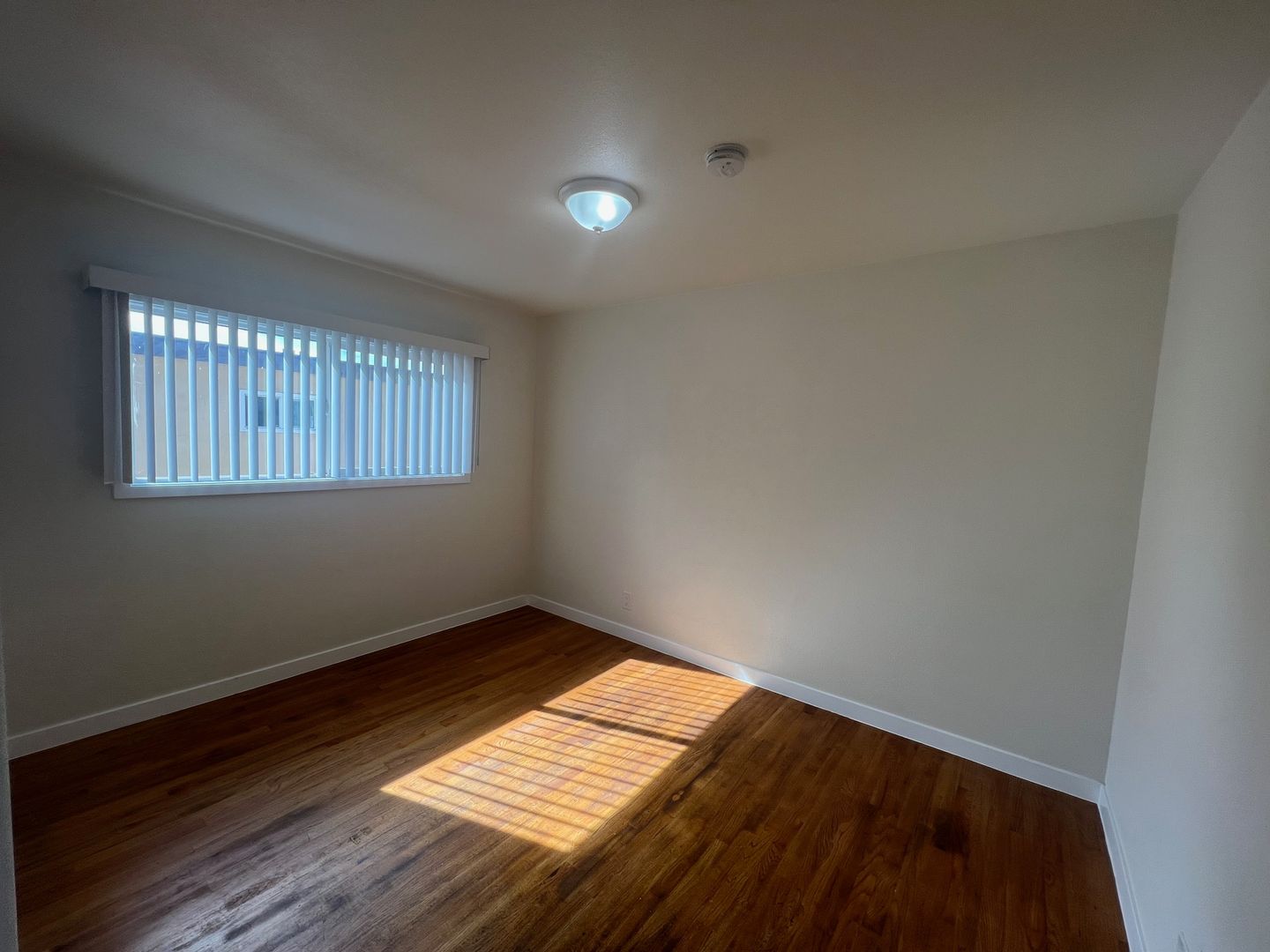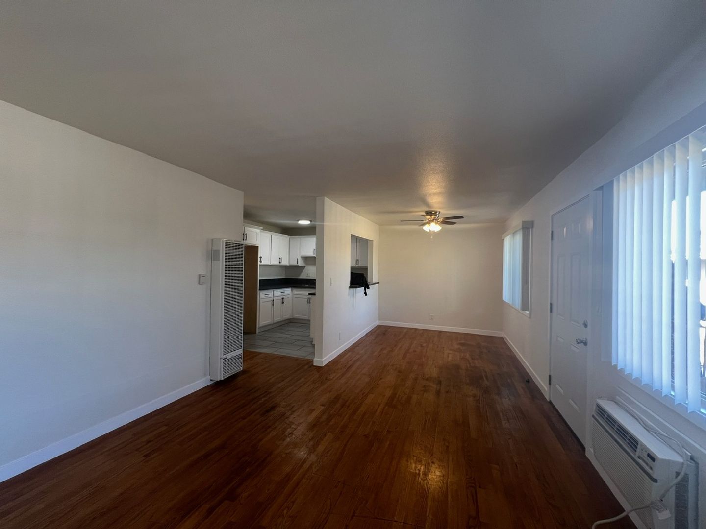 Upstairs Remodeled 2 Bedrooms 1 Bathroom Apartment, with newer paint, newer blinds, wood floors, newer kitchen cabinets & countertops, gas stove, ceiling fans, wall heater, 1 car parking, laundry onsite, pool onsite, and water/trash included.