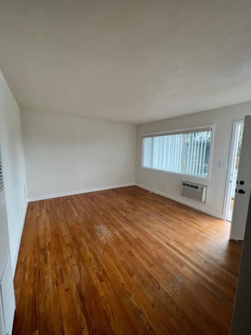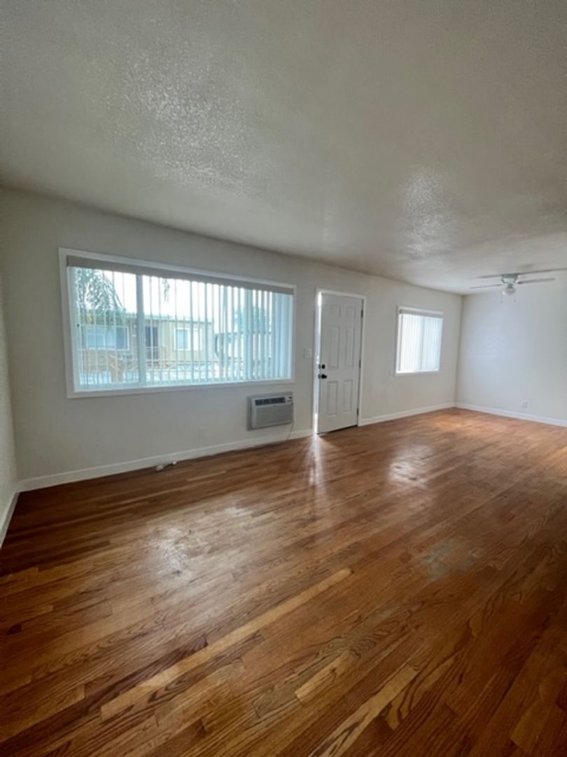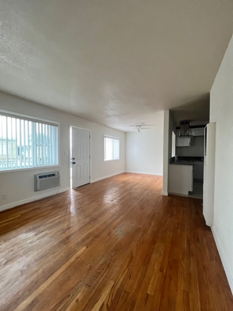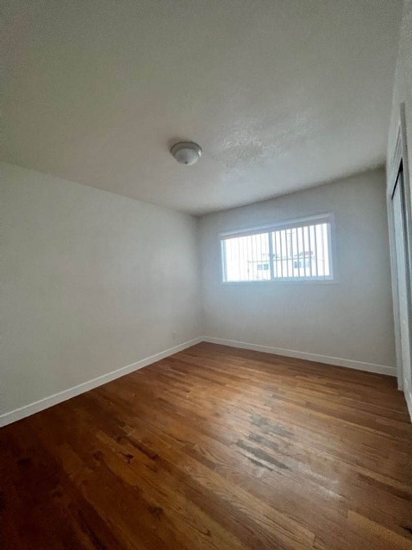 Santa Ana Location! Upper 2 Bedroom 1 Bathroom Apartment, wood flooring throughout, new paint, newer blinds, newer kitchen cabinets & counter tops, gas range, wall heating, hallway closet, 1 car parking only, laundry onsite, pool & BBQ area, water & trash included.